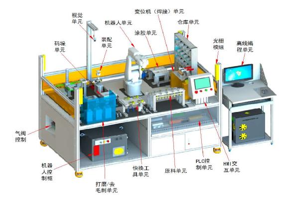 1 、本設備是工業機器人專業教學訓練綜合實訓設備采用模塊化配置思路,主要包括機器人單元、裝配單元、視覺單元、運動軌跡單元、碼垛單元、快換工具單元、打磨單元、焊接單元、去毛刺單元、倉庫單元、人機交互單元、 PLC 單元、離線編程單元、桌面平臺單元以及氣泵等。根據訓練及考核任務,可快速更換不同模塊,實現不同難度不同技能點的考核。系統深度集 成了離線編程技術,軟件不僅包含硬件平臺的三維模型資源,還大大簡化了涂膠、打磨、 焊接、碼垛等工藝實現的編程過程、提高軌跡復現精度、避免發生碰撞干涉。該工作站不僅滿足了職業院校不同專業學生針對工業機器人的操作和編程的教學需求,任務源于工業的特征也使其更加適于作為訓考平臺。 平臺展示了工業自動化智能制造、生產數字化、控制網絡 化、系統集成化等思想,涉及智能控制技術、工業機器人技術、機電一體化技術、計算 機應用技術、軟件技術、相機測量技術等領域的知識和技能。