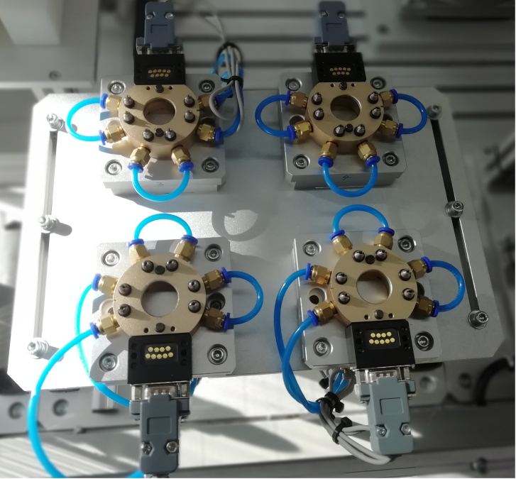 7 快換單元:由 4 種夾具組成,配合機器人使用作搬運、涂膠、焊接、碼垛等用途。配置快換公頭 1 個、快換母頭 4 個、搬運夾具 2 套、涂膠夾具 1 套、焊接工具 1 套、電磁閥 3 個,并標準固定機構,移動式底板。