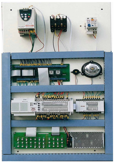 電梯的電氣控制系統采用三菱可編程控制器 (PLC) 實現邏輯智能控制,松下 VF200 交流變頻調速驅動,其硬件構的組成及功能與實際電梯完全一樣。 具有自動平層、自動開門關門、順向響應轎廂內外呼梯信號、直駛、電梯安全運行保護以及電梯急停、慢上、慢下、照明、風扇等功能。且具有性能可靠、運行平穩、操作簡單、能耗低和便于教學等特點。