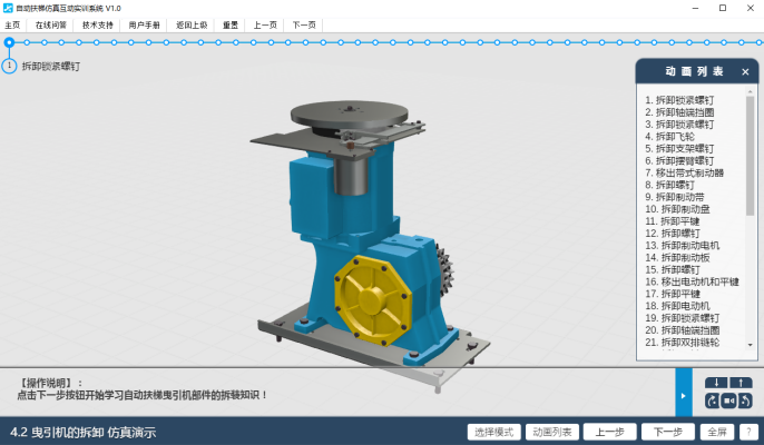 4 、扶梯拆卸仿真演示通過(guò)三維交互的動(dòng)畫來(lái)動(dòng)態(tài)的展示扶梯拆卸過(guò)程,按照特定的邏輯順序而設(shè)定,有拆裝的先后順序,符合實(shí)際操作中的流程和順序。此模塊是為了第一次使用拆裝仿真的師生,熟悉正確的操作流程和拆裝順序以及注意事項(xiàng)。在扶梯拆卸引導(dǎo)練習(xí)模式中,將要拆裝的零件會(huì)閃爍發(fā)光,提示用戶當(dāng)前應(yīng)該拆裝此零部件,點(diǎn)擊該零件,將反饋一個(gè)正確的提示音并播放該零件的拆裝動(dòng)畫,如果操作錯(cuò)誤,將反饋一個(gè)錯(cuò)誤提示音并視為無(wú)效操作不播放任何動(dòng)畫,直到選擇正確拆裝順序的零件,軟件才會(huì)播放其對(duì)應(yīng)的動(dòng)畫,完成之后再開(kāi)始下一動(dòng)作。