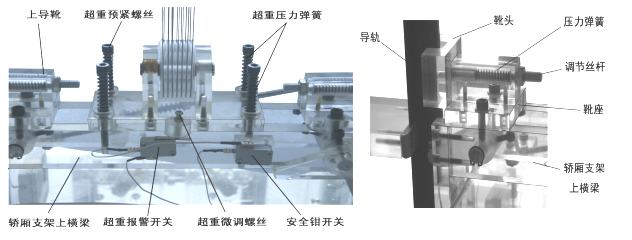 本公司設計的透明限速器,能調整到電梯模型實現限速器觸發安全鉗制動所需要的速度,真實演示電梯安全運行保護功能 ( 電梯模型轎廂運行速度低于實際電梯的速度 20-30 倍)。由于實際電梯無法實現在故障狀態下的超速運行,因此永遠無法真實演示限速器觸發安全鉗制動的安全運行保護功能,讓學生觀察了解安全運行保護機電聯合控制的過程。