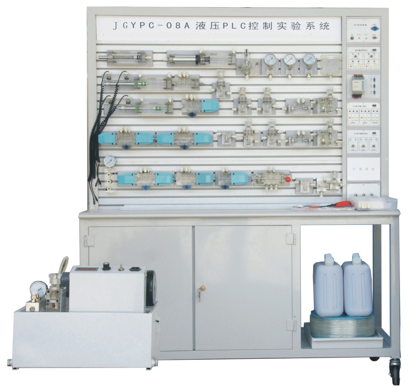 JGYPC-08A液壓PLC控制實驗系統是根據《液壓傳動》等通用教材內容要求,參考廣大師生的建議,精心設計而成。該系統除了可以進行常規的液壓基本控制回路實驗外,還可進行液壓控制技術應用實驗、液壓技術課程設計,以及可編程控制器(PLC)學習及其基本應用實驗等,是機電完美結合的典型實驗設備。
