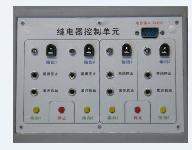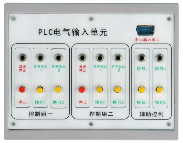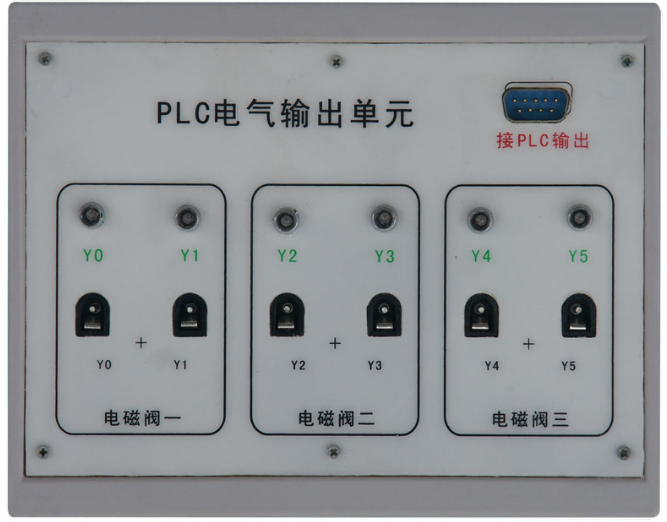 (4)輸入模塊:與PLC采用電纜9針232接口連接。連接后為PLC提供8路主令輸入信號(其中2路為常閉信號),及通過信號插孔為PLC提供自動控制信號。(如:行程開關位置信號等);輸出模塊:與PLC采用電纜9針232接口連接。通過輸出接口插孔控制電磁閥通斷;繼電器控制模塊:與電源模塊連接后,進行主令信號控制,及提供自動控制信號接口進行自動控制。通過輸出口插孔控制電磁閥通斷。