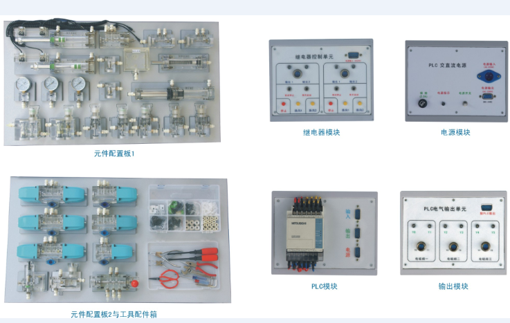 液壓實驗元件1套,液壓實驗PLC電氣控制系統1套;液壓實驗繼電器控制模塊1套;液壓實驗泵站1臺。(計算機根據學校要求另行配置)。實驗臺設計有專用的原件配置板,每個元件都有一個固定的放置位置。有利于實驗器件的管理。配備了:雙作用油缸(帶行程撞塊)、彈簧回位油缸、液控單向閥,減壓閥,輔助油箱,壓力繼電器,增壓油缸,節流閥(直動式),單向閥,順序閥等常用的液壓元件。