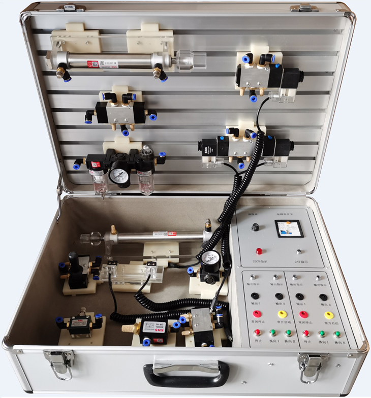 1、實訓箱主要由鋁合金機箱、各種標準氣動工業(yè)元件、和電氣控制器件等組成。