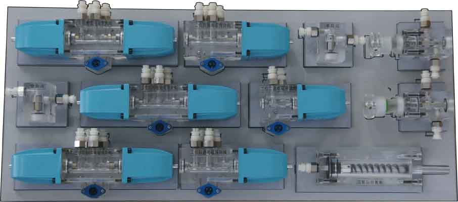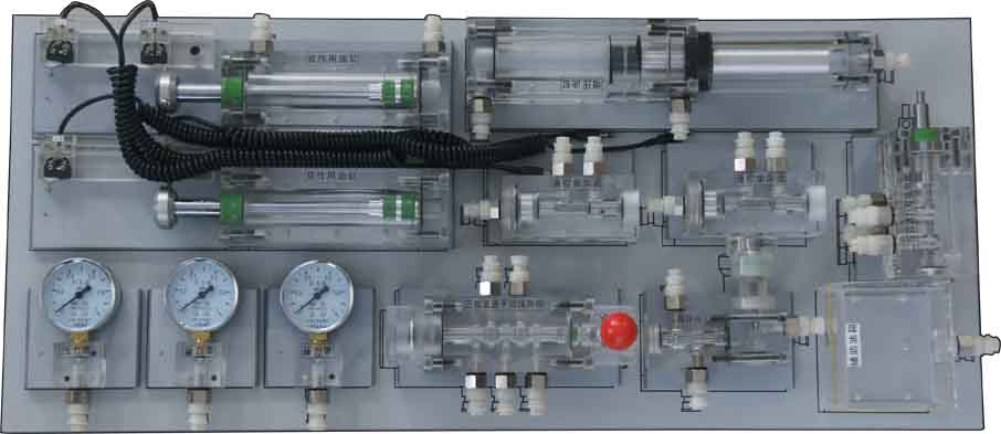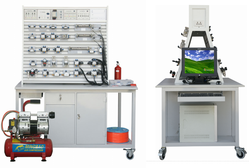 氣動面主要包括:梯形雙立面實驗臺、鐵質實驗桌、氣動元件(20多種)、電器控制模塊(5只)、空氣壓縮機、元件固定配置板、工具及附件等。