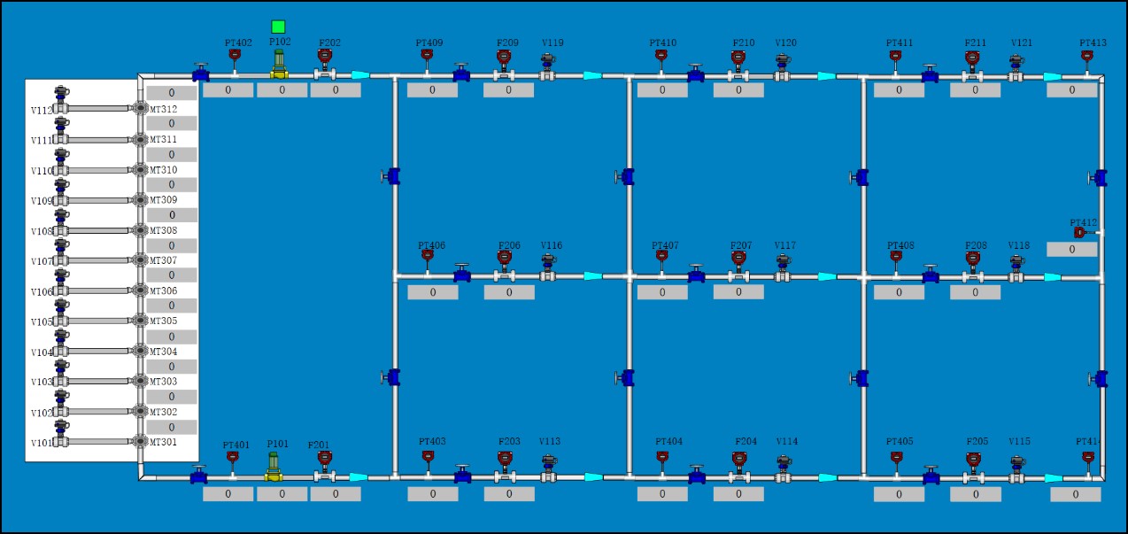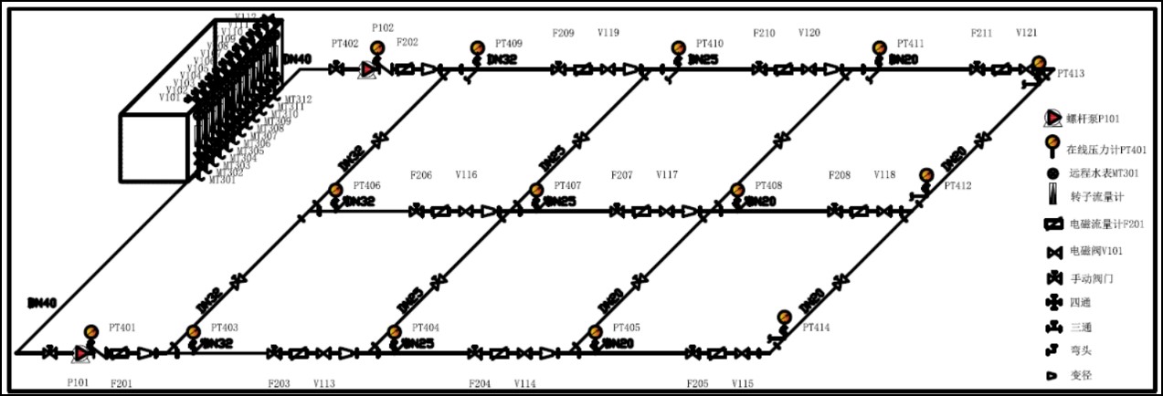 市政給水管網(wǎng)中的水流狀態(tài),是一個(gè)隨供水壓力和實(shí)際用水量變化而時(shí)時(shí)改變的復(fù)雜狀態(tài)。室外給水管網(wǎng)仿真實(shí)驗(yàn)通過對水泵工作頻率的改變來實(shí)現(xiàn)水泵工作揚(yáng)程的改變,從而模擬市政給水管網(wǎng)供水壓力的變化;通過調(diào)整用水節(jié)點(diǎn)閥門的開啟來實(shí)現(xiàn)管網(wǎng)中用水量的變化,從而來觀察由于供水壓力、水量和節(jié)點(diǎn)出流的改變而引起的管網(wǎng)工作狀態(tài)的變化和觀察室外給水管道系統(tǒng)的管中流量、節(jié)點(diǎn)壓力變化、管道水頭損失等過程。
