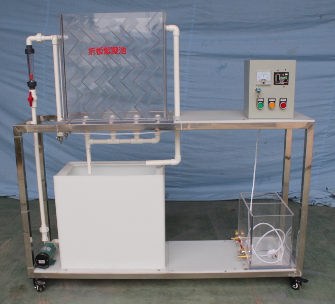 給水處理中澄清工藝通常包括混凝、沉淀和過濾,處理對象主要是水中懸浮物和膠體雜質。原水加藥后,經混凝使水中懸浮物和膠體形成大顆粒絮凝體,而后通過沉淀池進行重力分離。折板絮凝池就是混凝、絮凝沉淀兩種功能的凈水構筑物。本模型就是展示絮凝反應池和折板絮凝池內部構造的實驗裝置。