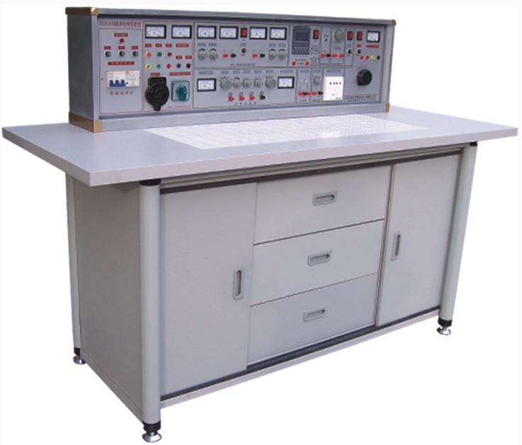 (一)實驗桌: 學生實驗桌 12 張,一桌二座,實驗桌外形尺寸為 160×70×80cm 。桌子中央配置九孔電路插板,電路板注塑而成,表面布有九孔成一組相互聯通的插孔,元件盒在其上任意拼插成實驗電路。元件盒盒體透明直觀,內裝電阻、電容、電感、二極管、三極管、場效應管、可控硅等元件來完成原理實驗。內裝元件一目了然,盒蓋印元件符號,線條清晰美觀。盒體與盒蓋采用較科學的壓卡式結構,維修、拆裝方便。實訓項目由二十幾套實訓電路板和相應元器件來完成。每張操作桌配有一粒膠皮板,保護通用電路板和桌面 ( 如需要在桌上放置電動機,焊接等 ) 桌子下部是元器件儲存柜,放置實驗元件、器材、工具等。