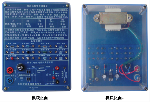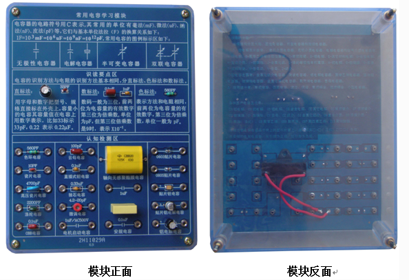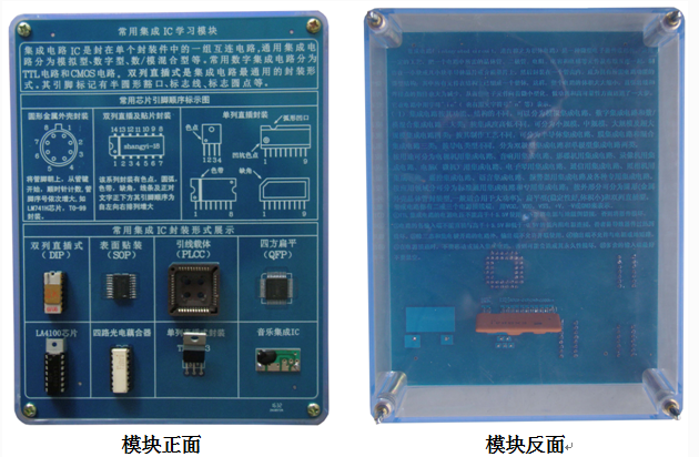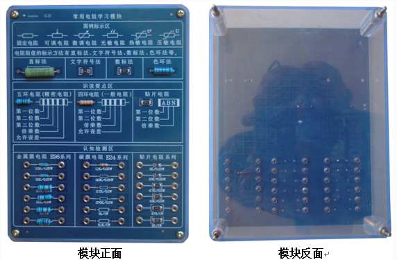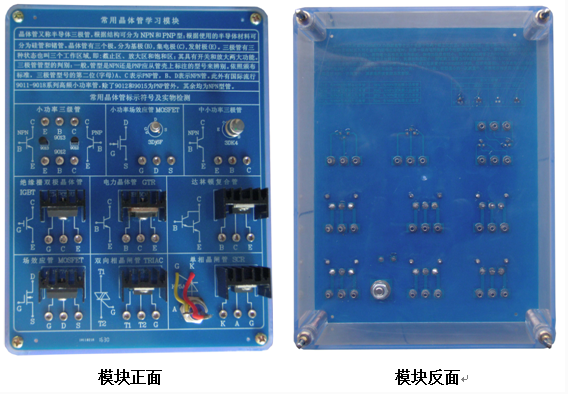 底盒使用 190mm × 145mm 的開模有機透明塑料底盒,模塊面板采用印制電路板 PCB 工藝,可以直觀看到器件的實物及相關(guān)的原理介紹。對于典型應(yīng)用及易損器件安裝在面板背面,透過透明底盒能夠看到器件實物,方便感性認(rèn)識、檢測測試,同時也能防止器件的損傷。