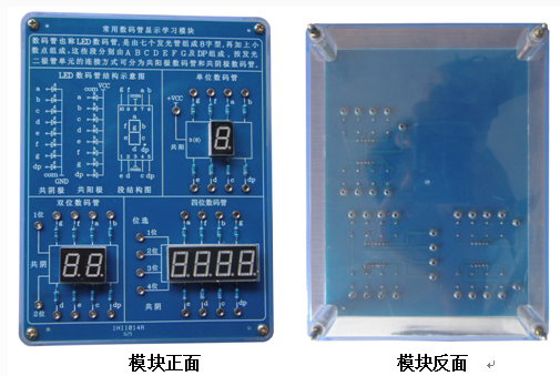 展示共陰及共陽數(shù)碼管的結(jié)構(gòu)示意圖及常用數(shù)字的數(shù)碼顯示方法,展示了單位數(shù)碼管、雙位數(shù)碼管、四位數(shù)碼管的實物并提供了可供檢測的臺階插座(內(nèi)孔 2MM )。