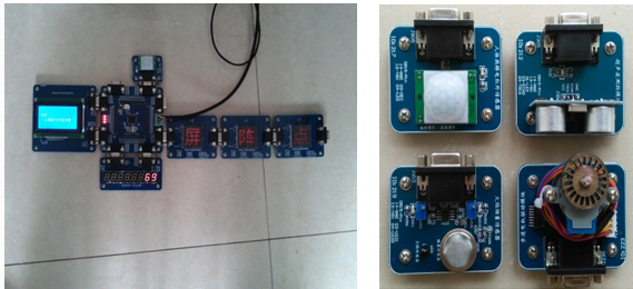 該模塊無論從最基本的顯示元件 LED 發光二極管,還是到最高級的 LCD 顯示屏都包含在內。具體配置為 8 位跑馬燈(邏輯電平指示)、 8 位數碼管動態顯示、 16 × 32 點陣 LED 屏、 1602 字符型液晶顯示屏、 128 × 64 繪圖液晶顯示屏。單片機常用的顯示器件全部包含在內,使學習者可以接觸所有的顯示方案,設計人機界面時可以得心應手。