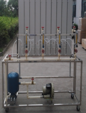 不銹鋼實驗臺、旋渦氣泵、穩(wěn)壓罐、供氣干管、用戶支管、用戶流量計、壓差板、單管壓力計等組成。氣泵工作產(chǎn)生的氣流進入穩(wěn)壓罐,經(jīng)瀉流穩(wěn)壓后,供給模擬的燃氣用戶,每個用戶由支管、流量計和尾閥組成,在壓差板上設有9只單管壓力計,可分別測量干管起點的壓力、用戶支管及包含燃具的阻抗在內(nèi)的壓差,而第9只壓力計則既測量最終用戶的阻抗,又是干管的終點壓力。通過調(diào)整瀉流閥、用戶流量及尾閥進行實驗。