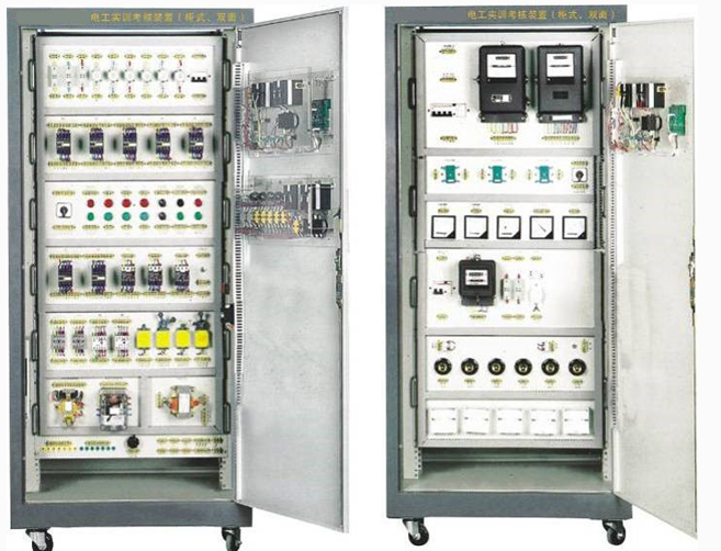 電機電控配線安裝實訓(xùn)柜以標準的配電柜為主柜,合理利用柜體的雙面空間,科學(xué)地布置電器及配套實驗器材,面板裝有電流、電壓表及操作按鈕,內(nèi)部裝有完成電動機控制電路所需要的各種低壓電器,如漏電斷路器、熔斷絲、電流互感器、接觸器、中間繼電器、熱繼電器、行程開關(guān)按鈕、信號燈、轉(zhuǎn)換開關(guān)、電壓表、電流表等,為了延長電器使用壽命,各電器的接點都先與接線端子相連,再在端子上接線操作,以求經(jīng)久耐用,能滿足照明電路和電動機控制電路的實訓(xùn)項目。