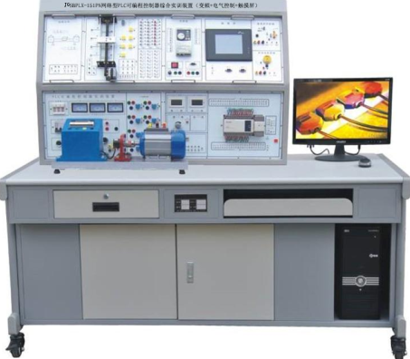 PLC 可編程控制器綜合實訓裝置由控制屏、實訓桌、主機實訓組件、實訓模塊(含豐富的工業現場設備模擬實訓對象)、變頻器掛箱、觸摸屏掛箱、交直流電機、總線單元、通信模塊、電機導軌、測速機構等組成。