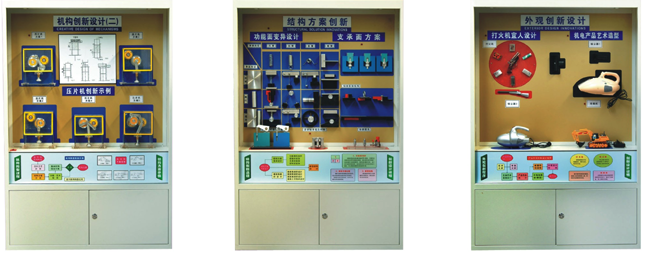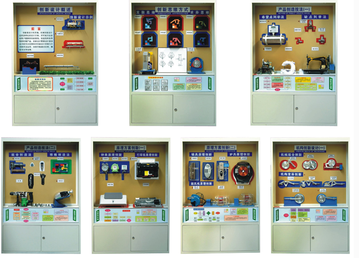 本陳列柜按國際標準流行設計,采用各種新穎機電產品外,欺其余模型全部用鋁合金和有機玻璃制作,每柜進行彩噴圖文說明,介紹機械創新設計的基本原理與方法,對提高機械創新意識與創新設計能力具有重大作用。是機械創新實驗室內主要教學設備。
