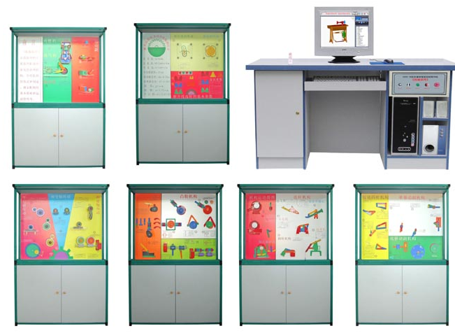本《機械原理》陳列柜是根據大、中專院校、技校、職業學校的機械原理教學大綱而設計的一套電化多媒體教學設備。陳列柜共分十個柜和一個電腦控制臺,進行多媒體聲控同步解說演示。由 PC 機電腦控制順序或任選運行每個柜模型動作,同時電腦播放圖像或三維動畫同步模型動作。
