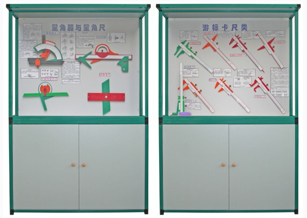 量具是測量零件的尺寸、角度等所用的測量工具,是指能直接表示出長度的單位和界限的計量用具。如鋼直尺、游標卡尺、量角尺、量塊、量規等。機械零件有各種不同的形狀和精度要求,因此量具和量儀也有各種不同的類型和規格。本套陳列柜共分五個柜,分別介紹機械制造中常用的各種量具上。陳列柜上下柜整體采用彩色塑鋼制作,堅固耐用。