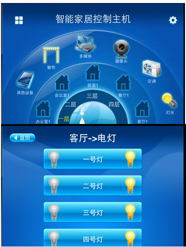 4、系統分區管理,模擬三室一廳包函廚衛等智能照明,安防,空調,電視,音樂,等家電的控制與監控。