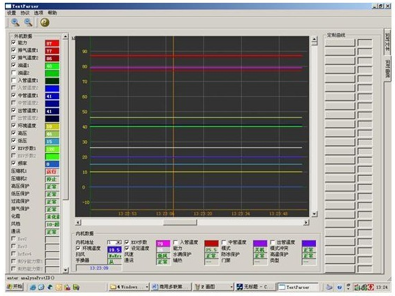 2)、軟件控制,能在線控制系統(tǒng)的溫度,讀取機(jī)組在最佳溫度系統(tǒng)制冷冷媒的流量開度數(shù),調(diào)整制冷機(jī)組的過熱度,過冷度。該文本顯示界面的左側(cè),以文本的形式實(shí)時顯示當(dāng)前機(jī)組的運(yùn)行數(shù)據(jù)。在界面右側(cè)的上半部分,是對通訊信息的顯示,包括通訊角色及通訊端口的設(shè)定值以及對當(dāng)前通訊狀態(tài)的顯示。在界面右側(cè)的下半部分 " 數(shù)據(jù)信息 " 中,顯示當(dāng)前接收到哪種數(shù)據(jù)幀、接收到的數(shù)據(jù)幀的地址、等信息。具有上位機(jī)調(diào)節(jié)的線上和手動調(diào)節(jié)功能: