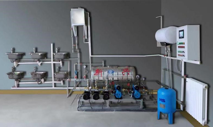 2 、熱水給水系統:主要有電加熱鍋爐、熱水給水管道、水龍頭和淋浴頭等組成。管路采用 PPR 管進行設計,可進行 PPR 管的切割、熔接、安裝和通水試驗操作,可對鍋爐進行溫度調節控制操作。